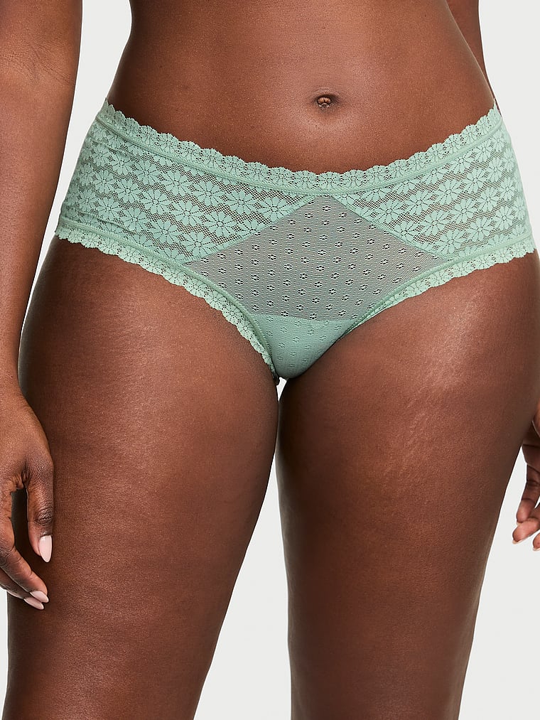 Our new daisy-motif lace sweetens this mesh Cheeky, complete with a cutout in back for a flirty finish.